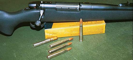 Интересно, что пуля .375, особенно тяжелая 300-грановая, не оставляет серьезных гематом в теле добычи даже при стрельбе с относительно коротких дистанций. Под патрон этот сконструировано великое множество карабинов и штуцеров. Хотя, замечу в скобках, штуцер под безрантовый патрон этого калибра – некоторая вещь в себе, хотя бы потому, что система экстрагирования безрантовых гильз лично мне не внушает особого доверия, а калибр этот подразумевает довольно рискованные охоты. Нет под .375 и полуавтоматов. Зато карабинов различных систем и производителей сколь угодно много. Патрон этот, несмотря на мощь, точен и в хороших руках позволяет вести уверенную стрельбу на 200 и даже 250 м.
